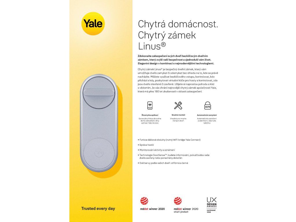 Chytrý zámek Linus určený pro zamykání a odemykání dveří odkudkoliv (pomocí WiFi Bridge Yale Connect), s kontrolou zda jsou dveře otevřené/zavřené. Bezklíčový vstup, správa příchodů s deníkem událostí. Lze poskytovat virtuální klíče pro hosty, jednorázové vstupy. Bez kabelů.